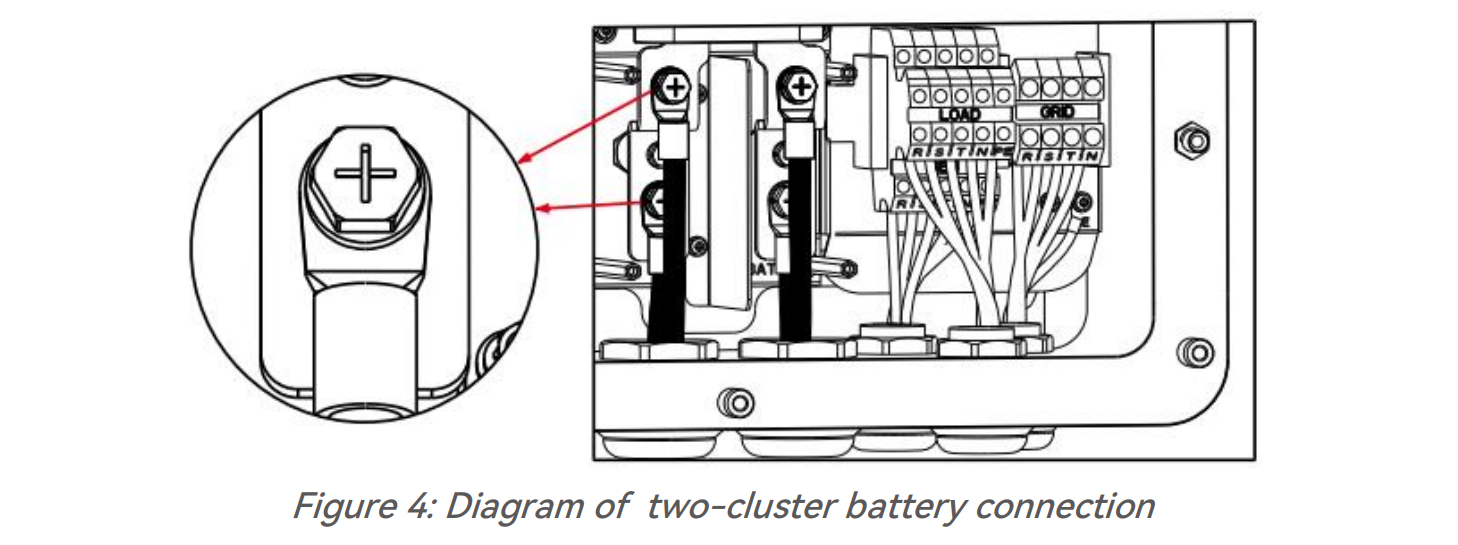 The WIT 4-15K-HU inverter has dual battery input ports, supporting the direct connection of two clusters of batteries, which reduces the need for an additional combiner box. If two clusters of batteries are installed, connect them respectively to the two sets of battery terminals inside the junction box. The wiring diagram is shown below:image.png